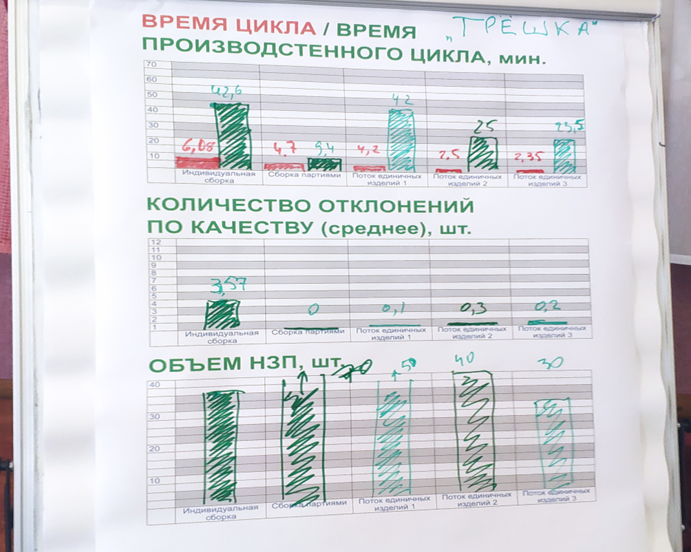 Напомню, что представляет собой этот тренинг. Тренинг предусматривает пять тестовых сборок изделий (индивидуальная сборка, сборка партиями и поток единичных изделий ) и набор коротких теоритических блоков (не более 10 минут). Кроме того, каждая команда получает время для самостоятельного анализа прошедших сборок и поиска оптимальных решений. В каждой тестовой сборке измеряются показатели: Цикл / Производственный цикл. Производительность труда, Количество деталей незавершенного производства, количество отклонений по качеству.