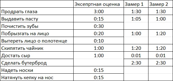 «Достать сыр» и «сделать бутерброд» — вообще в 2,5 раза длиннее оценки эксперта. Причем в реальности в ней зачем-то выделяют грошовое движение «достать сыр», которое практически ничего не стоит в отдельности.